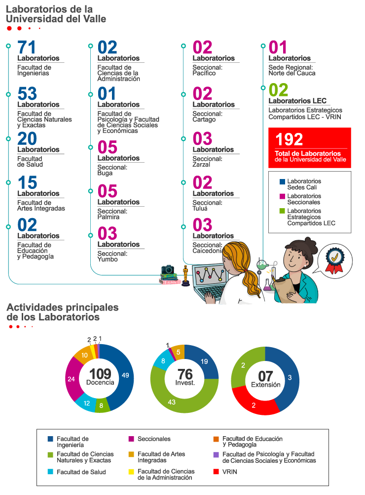 Esta sección proporcionará un análisis detallado sobre la distribución y cantidad de laboratorios en cada facultad y seccional de la universidad. A través de datos estadísticos actualizados, se mostrará cómo estos laboratorios están organizados y distribuidos, además, conocerás los laboratorios que apoyan las actividades misionales, tales como la docencia, la investigación, la extensión. El objetivo de esta información es resaltar la importancia de estos espacios en el fortalecimiento del Sistema Institucional Integrado de Laboratorios.